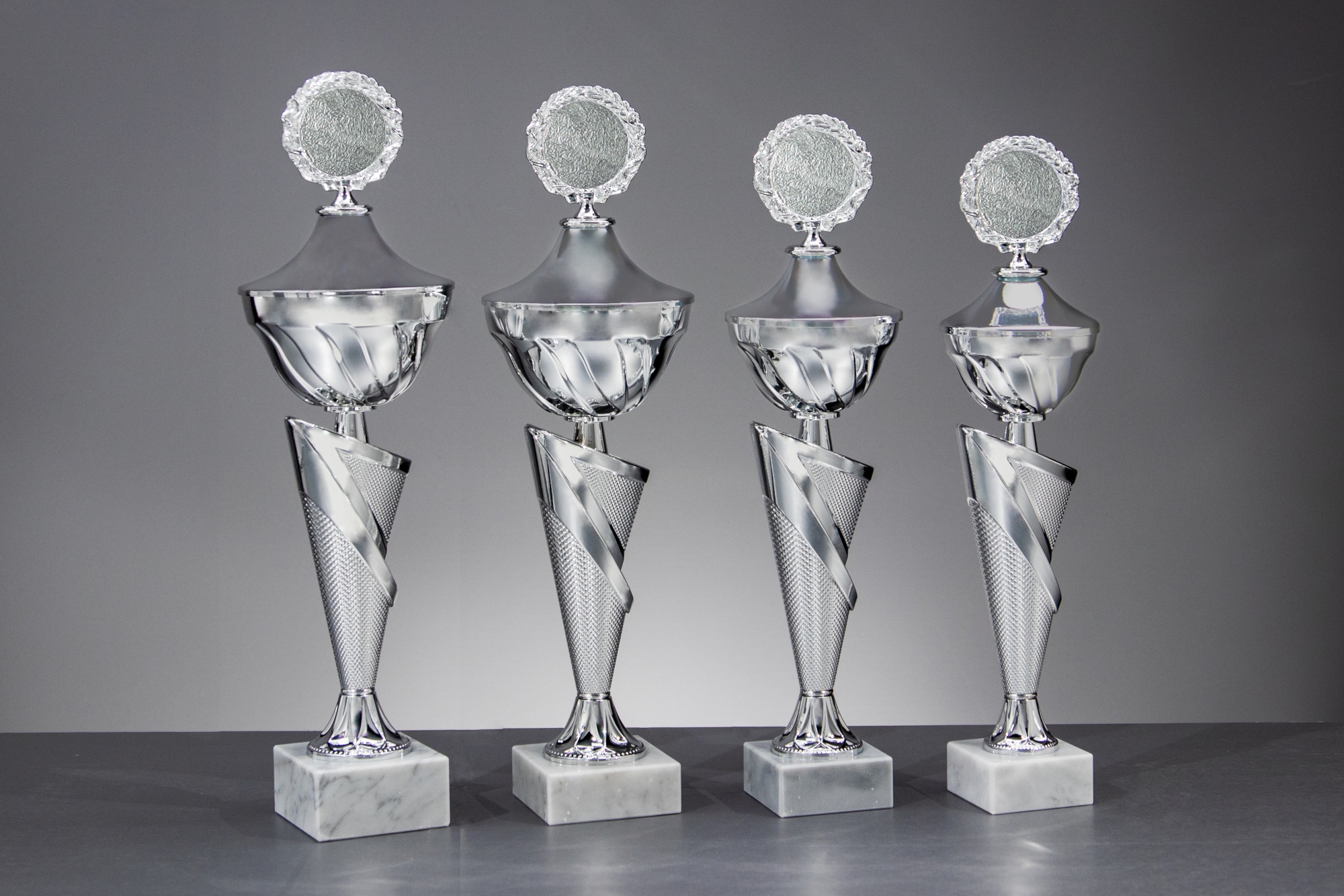 4er Pokal Serie in der Farbe Silber alles fest verschraubt. Kelch,Deckel und Ronde aus Metall, der Fuß ist aus Kunststoff auf Marmorsockel. Im Preis mit inbegriffen : Aluschild mit Ihrem Text , 5cm Ø Vereinslogo in Farbe oder Alu Sportemblem und die Montage. Plätze und evt. Sportemblem so angeben : 1 - 4 Platz Dart