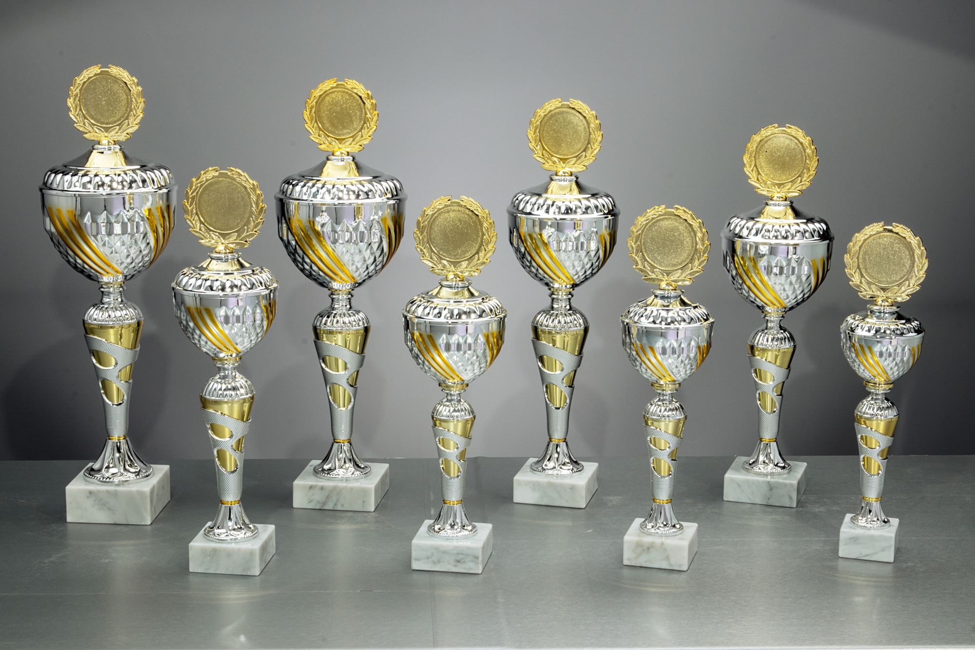 8er Pokal Serie in der Farbe Silber/Gold in 8 verschiedenen Größen erhältlich von 33,8cm bis 47,7cm oder als 8er Serie je Größe 1x zum Sonderpreis. Der Pokal ist fest verschraubt. Kelch,Deckel und Ronde aus Metall. Fuß aus Kunststoff auf Marmorsockel. Im Preis mit inbegriffen : Aluschild mit Ihrem Text, 5cm Ø Vereinslogo in Farbe oder Alu Sportemblem und die Montage. Plätze bitte z.B. so angeben : 1 - 8 Platz Tennis