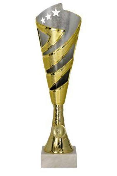 Silber/Goldener Pokal mit Sternenmuster, Oberteil und Fuß aus Kunststoff auf Marmorsockel. In drei Größen zur Wahl : 32,5cm , 35cm und 38cm oder als 3er Set zum Sonderpreis. Im Preis mit inbegriffen : Aluschild mit ihrem Text/Vereinslogo plus Vereinslogo auf dem Pokal und die Montage. Plätz bitte z.B. so angeben : 1 - 3 Platz