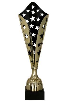 Gold/Schwarzer Metall Pokal mit Sternenmuster, Oberteil aus Metall , Fuß aus Kunststoff auf Marmorsockel. In sechs Größen zur Wahl : 34,5cm , 36,5cm , 39,5cm , 42cm , 46cm und 48cm oder als 6er Set zum Sonderpreis. Im Preis mit inbegriffen : Aluschild mit ihrem Text/Vereinslogo und die Montage. Plätz bitte z.B. so angeben : 1 - 6 Platz