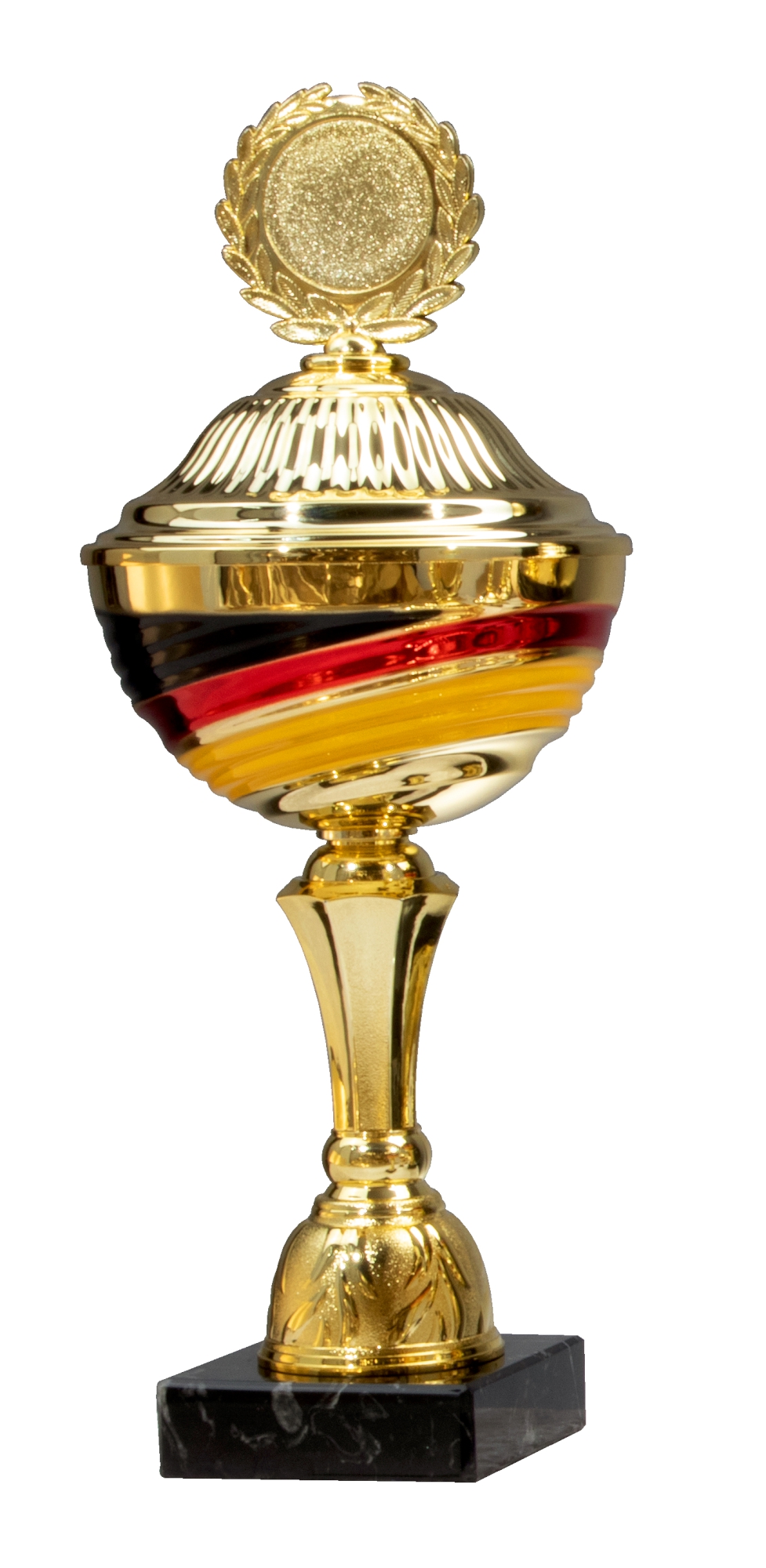 Eine günstige 8er Deutschland Pokal Serie mit fest verschraubtem Deckel. Größen von 27,7cm bis 41,5cm erhältlich. Deckel und Kelch aus Metall, Fuß aus Kunststoff auf Marmorsockel. Im Preis mit inbegriffen : Aluschild mit ihrem Text, 5cm Vereinslogo in Farbe oder Sportemblem und die Montage. Plätze und evt. Sportart(Emblem) z.B. so angeben : 1 - 8 Platz Fußball