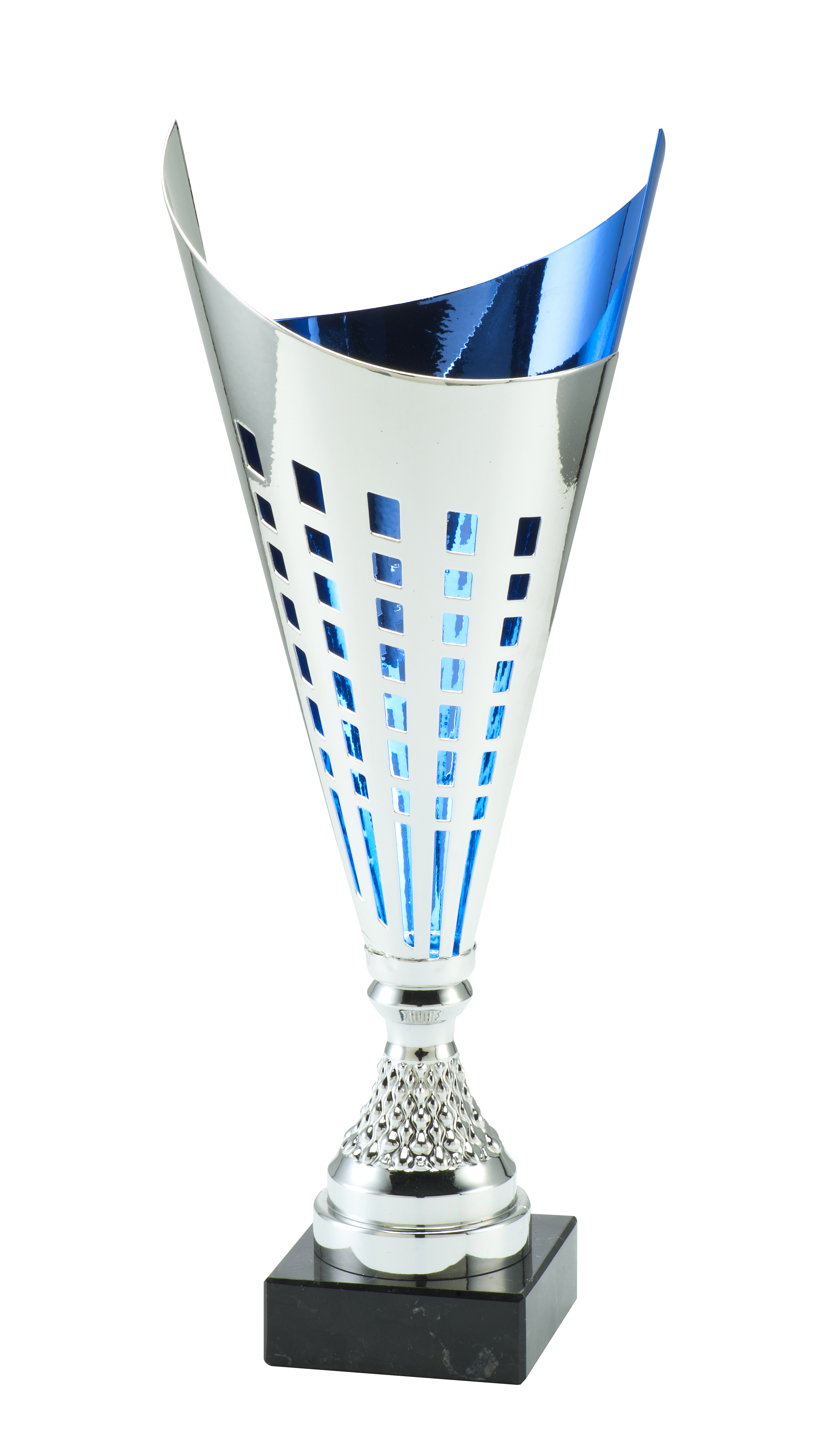 3er Pokal Serie in der Farbe SilberBlau von 36,5cm , 39,5cm und 42,5cm. Der Kelch ist aus Metall der Fuß ist aus Kunststoff auf einem Marmorsockel.